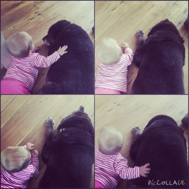 Kate is gek op dieren. Om te beginnen onze oude labrador. Zeker nu ze kruipt laat ze haar geen seconde met rust. Even aaien, aan haar staart trekken, of er gewoon bovenop of overheen. De hond vind het gelukkig prima, en is net zo gek op haar.