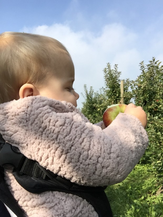 We plukken Elstar. Terwijl Kate geniet van een appeltje vul ik langzaam maar zeker de tas. Ik bedenk van te voren altijd dat ik me inhoud, en ‘maar’ tien appels, of ‘maar’ vijf peren mee neem. Ach ja. Met vol geladen auto thuis gekomen. Mooie blozende peren en heerlijk zoet-zure appels. Dat wordt taarten bakken…