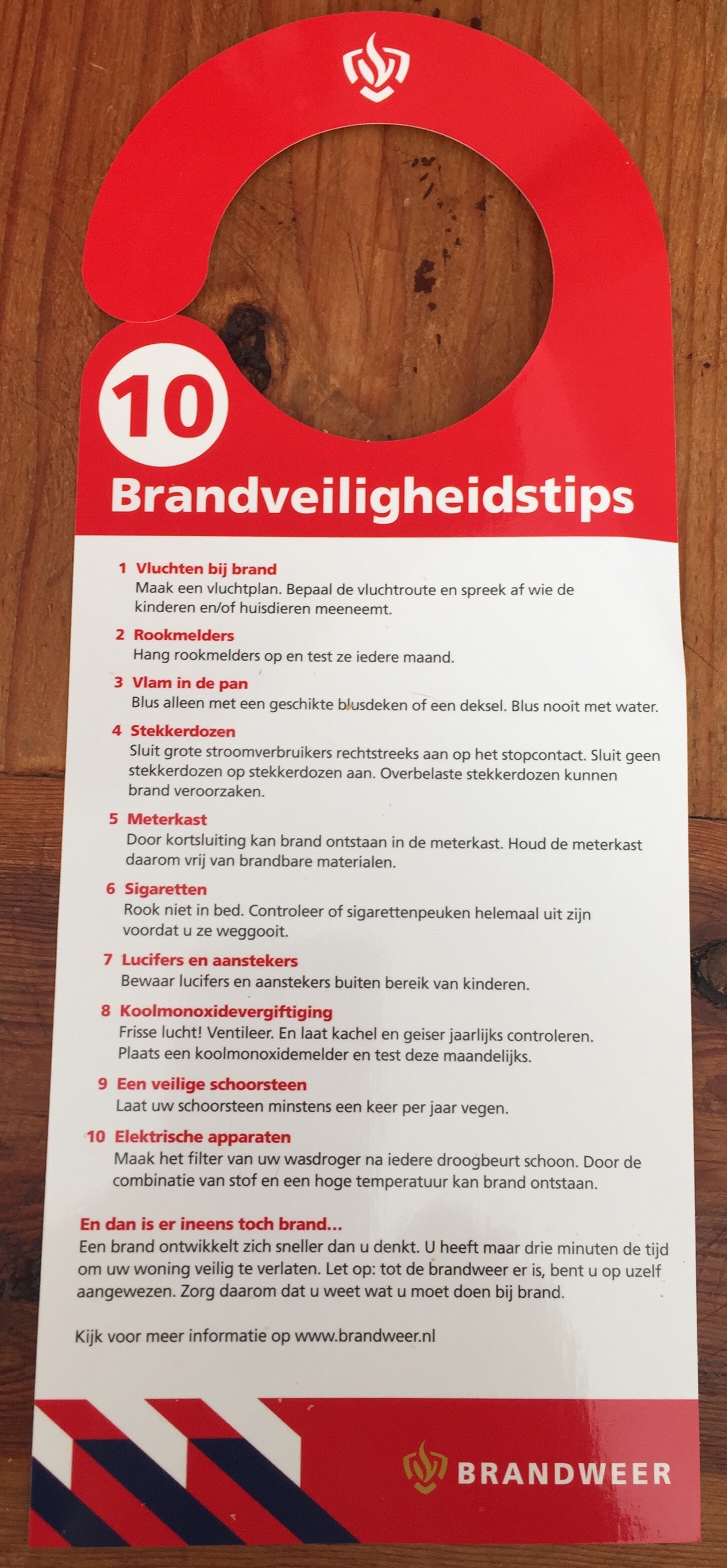 We zijn thuis goed beveiligd naar mijn idee. Er hangt in alle ruimte een rookmelder, er hangen CO2-melders en de deuren zijn van binnen uit makkelijk open te maken, zonder sleutel, ook bij slecht zicht door bijvoorbeeld rook. Als we niet naar beneden kunnen via de trap, kunnen we via de badkamer op het dak van de keuken. Onze tv’s hebben een schakelaar zodat ze van de stand-by functie af kunnen, er wordt niet gerookt en de droger draait alleen als we thuis en wakker zijn.