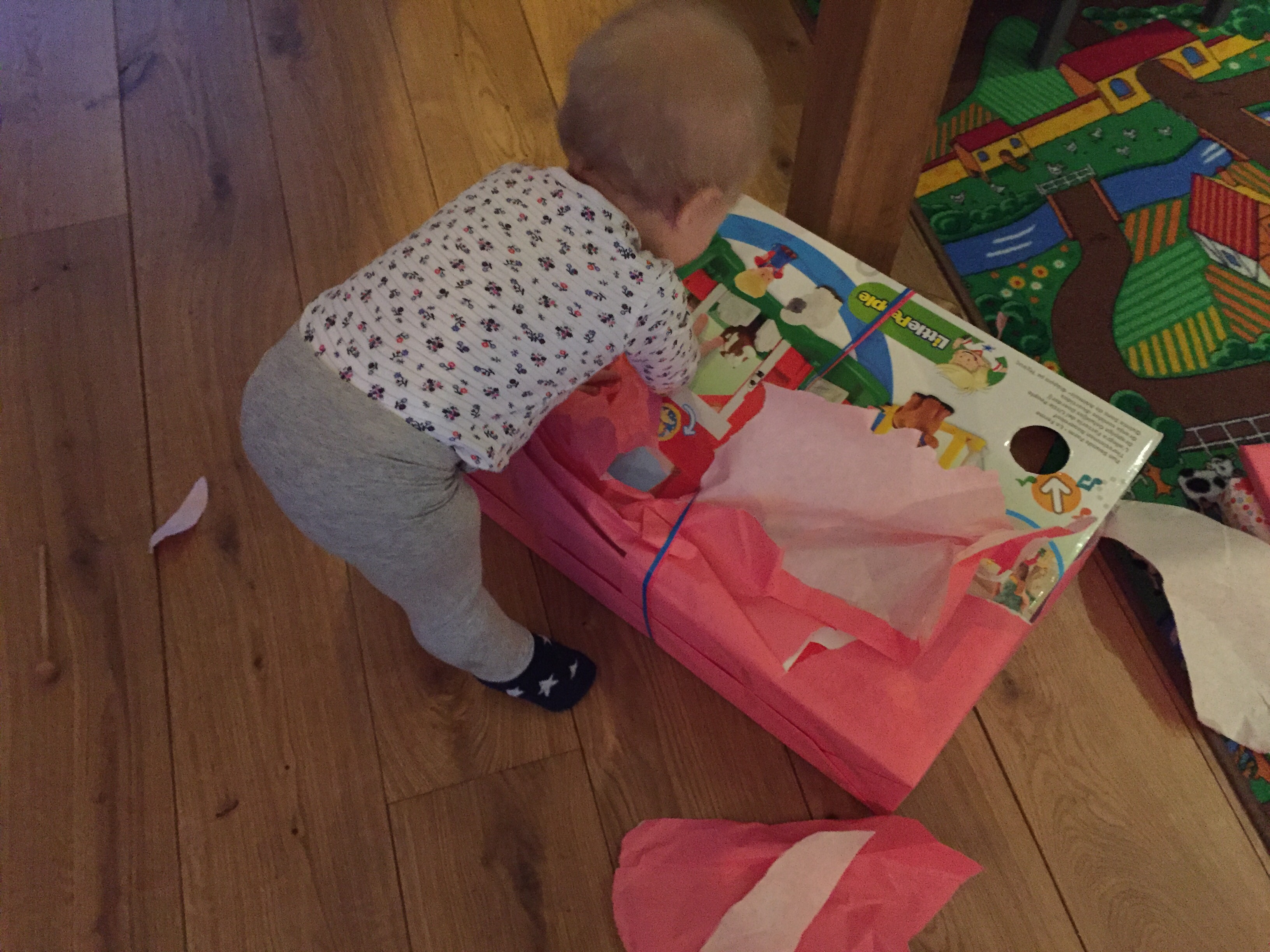 Voor haar verjaardag kochten we een tafeltje met twee stoeltjes en de boerderij van Little People. Een groot sucses, de rest van de ochtend speelt ze met de koe en het schaap en rijd ze met de tractor.