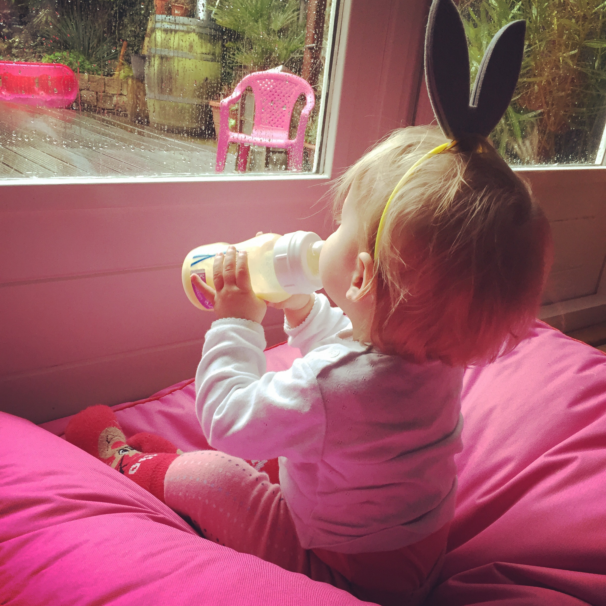 Vandaag met Kate naar beneden. Kopje koffie, flesje melk. Dan naar boven om papa wakker te maken. Stukje paas-stol mee, eitje gebakken, sinaasappeltje.