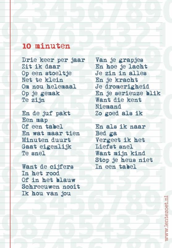 Dit gedichtje van Lentezoet zweefte vanavond in mijn achterhoofd. En dit is precies wat ik bedoel. Want eerlijk is eerlijk, geen kind is toch in tien minuten te vangen?