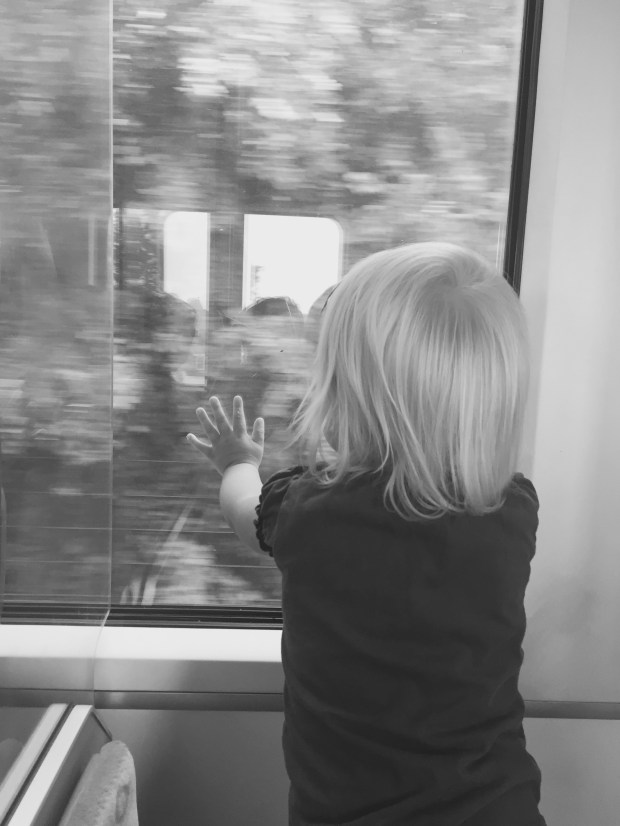 Vanaf de tweede trein loopt het wat stroever. De eerste fout? Kate uit haar wagen halen. Maar goed, ze wil zo graag meedoen, ook op een echte stoel zitten, uit het raam kijken. Ze verbaast zich over auto’s die we inhalen, koeien in de wei en mensen op het perron. Ik geniet van hoe zij geniet. Ze flirt met de mensen om ons heen, gaat zitten, staan, en neemt deze nog onbekende wereld in haar op.