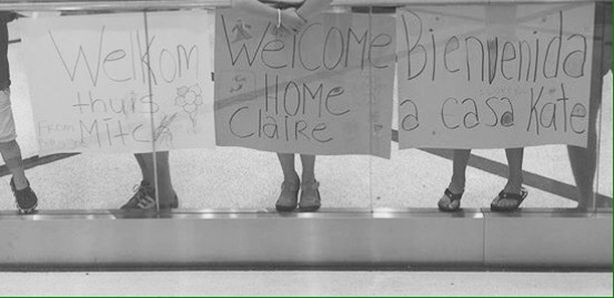Na een dag vliegen landen we brak op de luchthaven van Atlanta. We rollen de trap op en kijken zoekend om ons heen, waar staan ze? Daar! De familie staat met spandoeken achter de balustrade. Lekker, we zijn weer ‘thuis’.