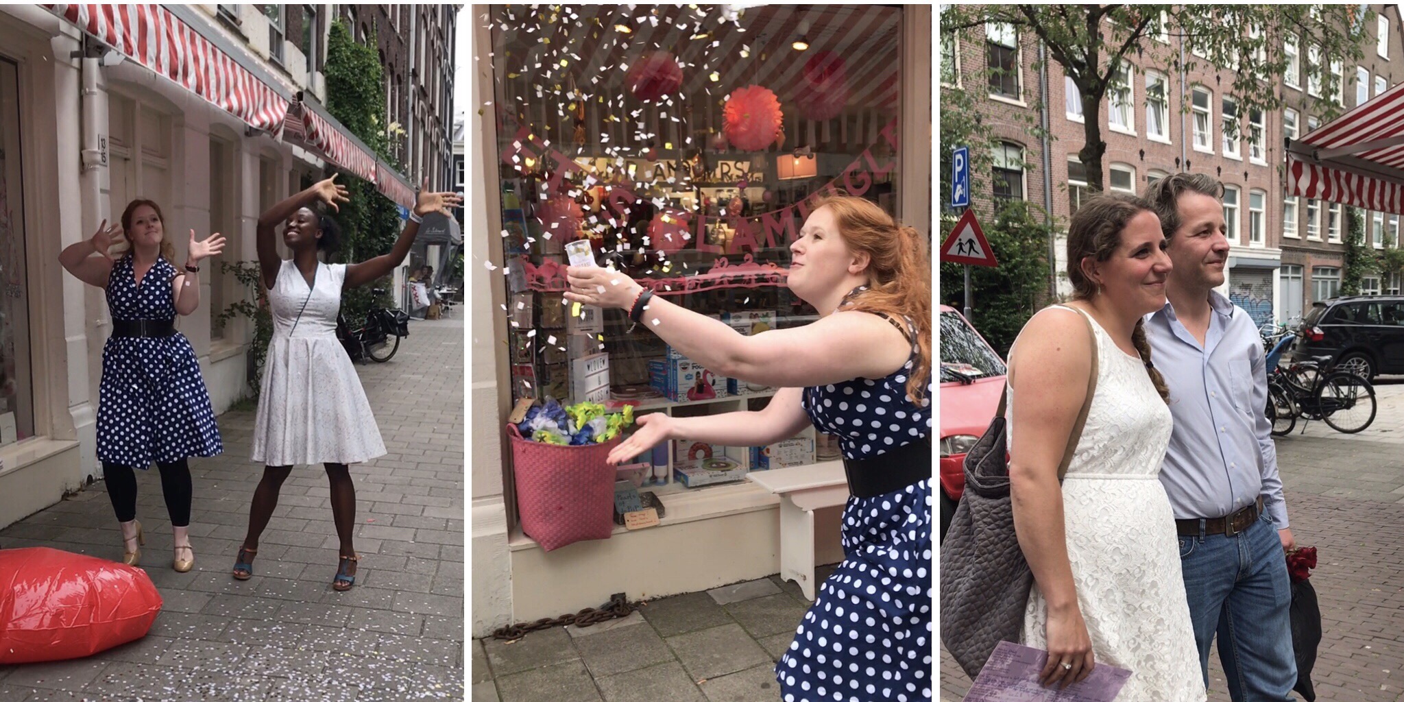 Met een verliefd hart verlaten we de winkel. Buiten wacht de volgende verrassing. De meisjes van theatergroep Blender wachten ons op en zingen ons toe. ‘All you need is love’ en ‘This will be (an everlasting love)’. Ballonnen, confetti, de hele Amsterdamse Pijp op zijn kop. We vieren vandaag de liefde en dat doen we niet half.