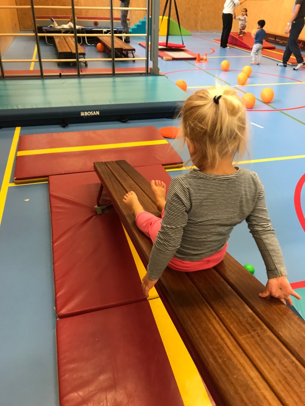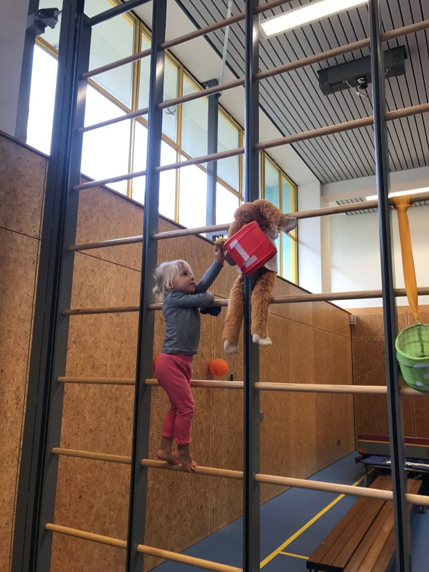 Voor Kate was het letterlijk één groot feest. Dit aapje kon niet wachten te beginnen en ging dan ook vol enthousiasme de toestellen op. Heerlijk om te zien hoe ze de eerste ronde een handje vroeg en vanaf de tweede ronde helemaal op ging in het spel. Zonder angst. Angst die mama af en toe wel voelde, wanneer ze zonder zorg steeds hoger dat klimrek in ging.