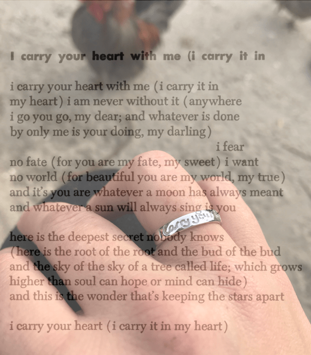 Toen ik een paar dagen later op een avond het gedicht ‘I carry your heart’ van E.E. Cummings tegenkwam in een schriftje viel het kwartje. Ik vind dit gedicht al jaren prachtig. Onvoorwaardelijke liefde. “Ik draag jou hart in mij”. Dit wilde ik verwerken in de ring. Ik zou zelf een zin uit het gedicht schrijven, en de papa van Kate vragen naar zijn hartslag.