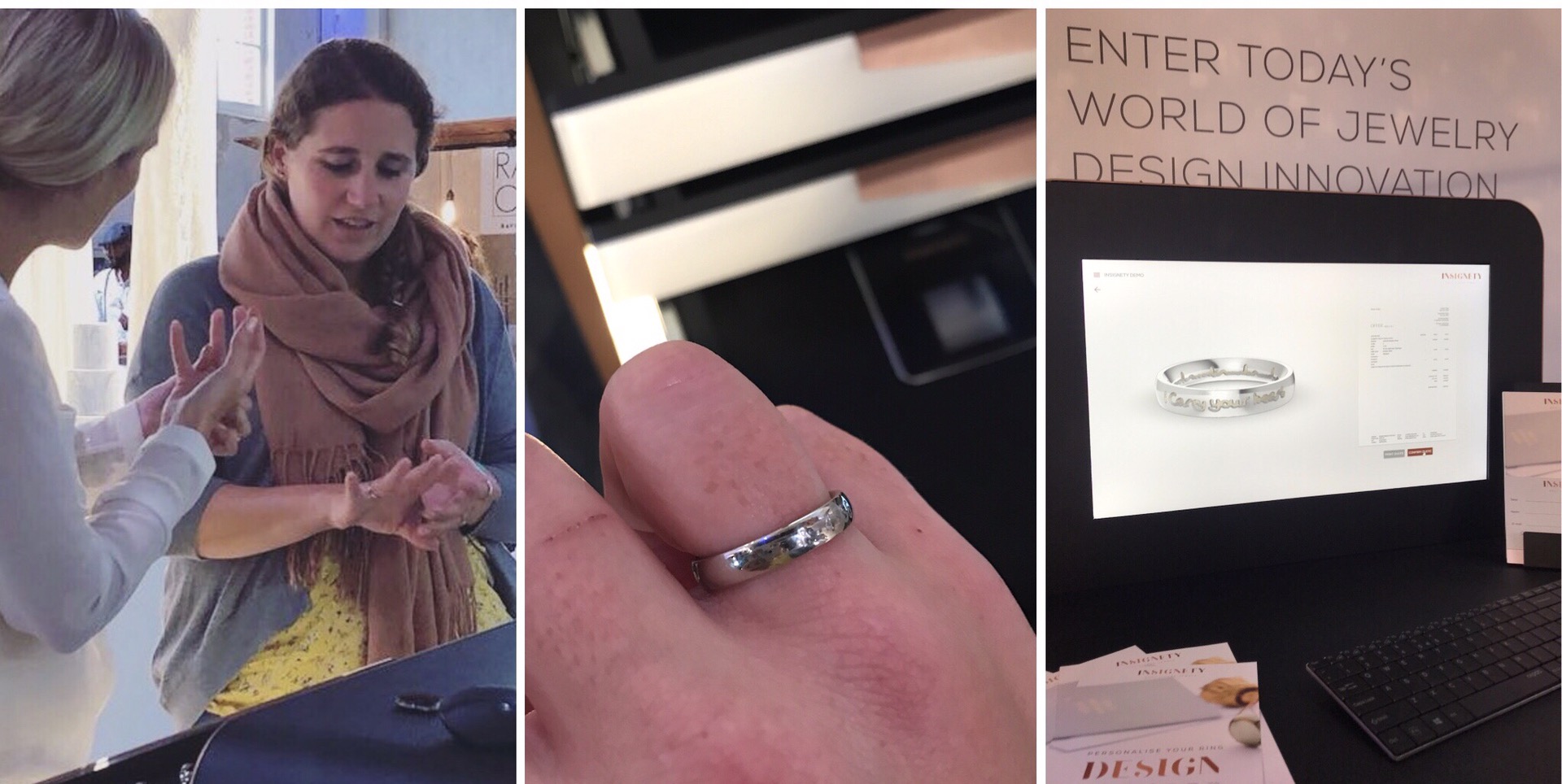 En dus, op naar het Westerpark. Op de beurs ontwierp ik stap voor stap de ring. Welke maat? Welke kleur? Hartslagen werden geregistreerd en ik schreef duizend keer de zelfde zin tot ik op en top tevreden was. Samen met Sales professional Amber maakte we het ontwerp met de Insignety software. Tot ik helemaal happy, en stapelverliefd op de ring de beurs kon verlaten.