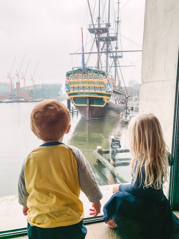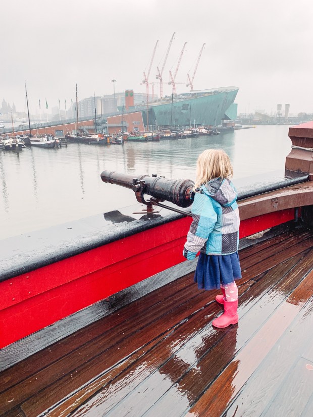 We besluiten ons bezoek door aan boord te gaan van het VOC schip ‘Amsterdam’. Kate vuurt de kanonnen af en ligt als ware matroos in een hangmat. Al bukkend (mensen waren serieus klein in die tijd…) bekijken we de kapiteinshut en staan we even aan het roer. En dan is het mooi geweest. Tijd om van boord te gaan en terug te lopen naar het station.