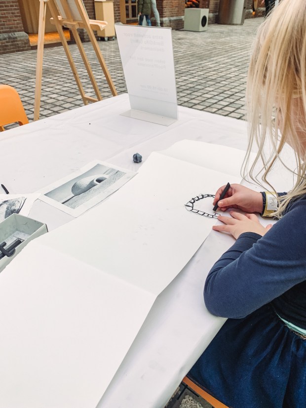 ‘De strijd om het ijs’ is een van de tentoonstelling stellingen die we overgeslagen hebben. Maar toch hebben we hem niet helemaal aan ons voorbij laten gaan. In de hoek van het Open Plein staat een collectie houtskool tekeningen. Het is het ‘Panorama Noordpool’ en de gasten worden uitgenodigd mee te werken aan het stuk. Tussen de werken vind Kate een leeg stuk papier dat ze aan tafel mag tekenen. Er liggen foto’s van de Noordpool ter inspiratie. Kate gaat voluit, zoals ik wel van haar gewend ben. Na een kwartier heeft ze twee pikzwarte handen en zitten de houtskool vegen in haar gezicht. Het kunstwerk is klaar en krijgt een plekje in het panorama, waarna Kate met een verrekijker nog even mag genieten van het beeld.